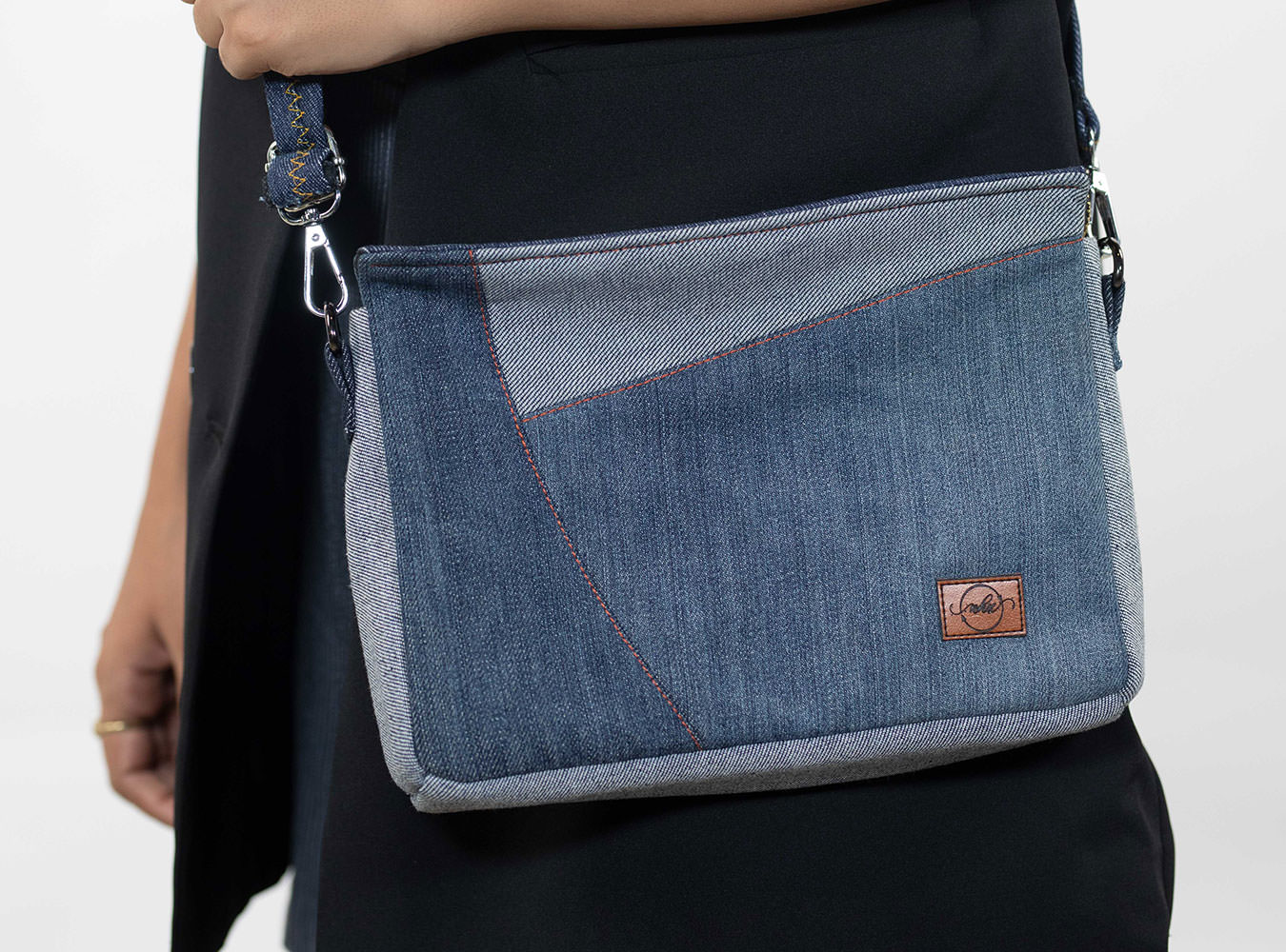 The Asymmetrical Sling Bag is a modern, eco-friendly accessory designed with a unique shape that stands out from ordinary bags. Crafted from upcycled denim, it combines sustainability with style, making it perfect for casual outings, travel, or daily use. Its compact yet functional design allows you to carry essentials comfortably while expressing a bold, creative fashion choice.